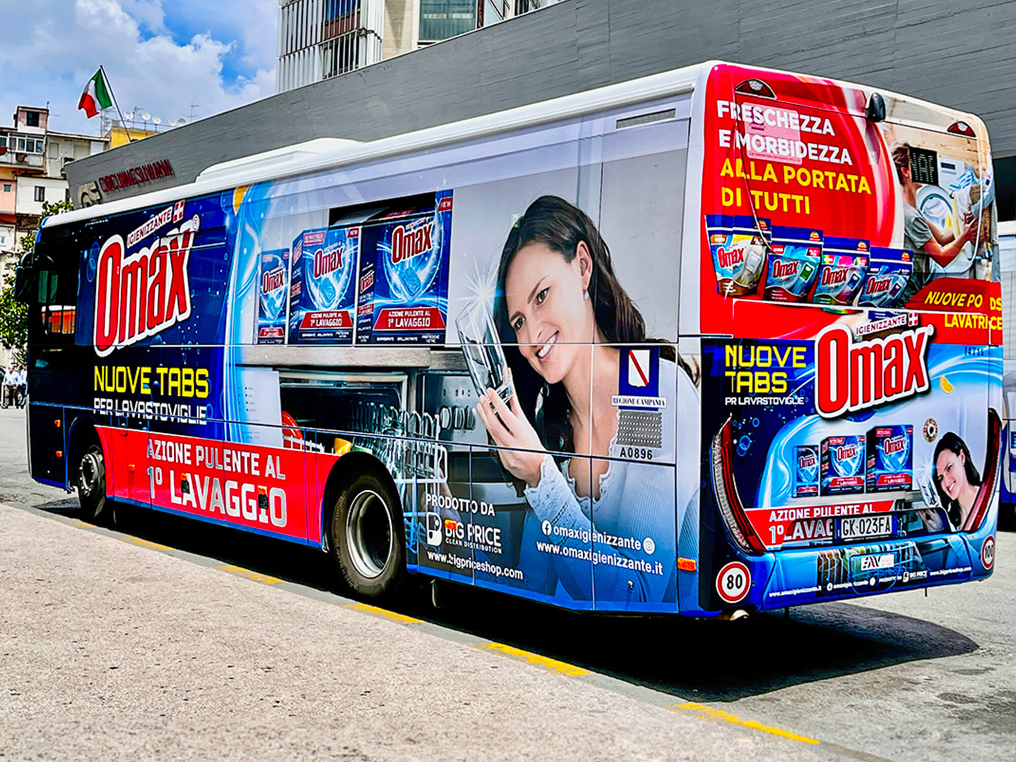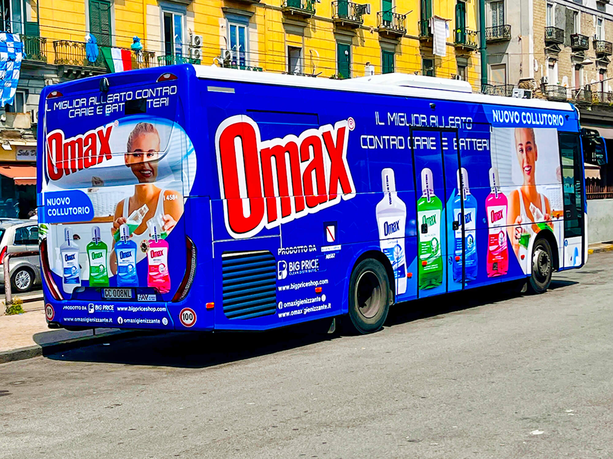 Ma non è tutto. Gli autobus sono stati trasformati in vere e proprie vetrine mobili per Omax. I full wrap e i side banner applicati sui mezzi di trasporto hanno amplificato ulteriormente la visibilità del marchio. Ogni volta che un autobus percorre le strade della città, diventa un ambasciatore itinerante di Omax, portando il messaggio del marchio a un pubblico vasto e diversificato. Inoltre, Allcool ha utilizzato adesivi landscape per creare una pubblicità dinamica ancora più performante. La scelta di utilizzare adesivi landscape è stata particolarmente efficace per creare un impatto visivo immediato e rendere il marchio Omax facilmente riconoscibile in diversi contesti urbani.